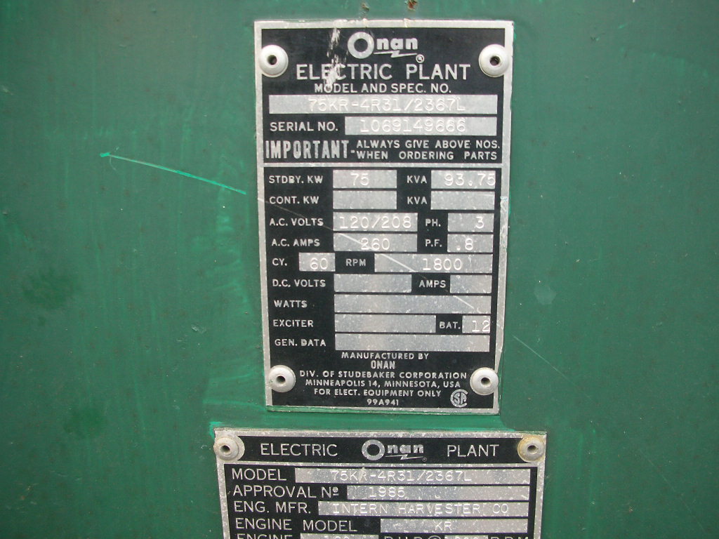 | Onan | 6 KW Onan 2 cylinder air cooled diesel . 758 hours on meter, 120 240 V single phase, 25 amps, 1800 rpm, mounted on good frame, no covers, large fuel tank, (ot) | $1,500 | |